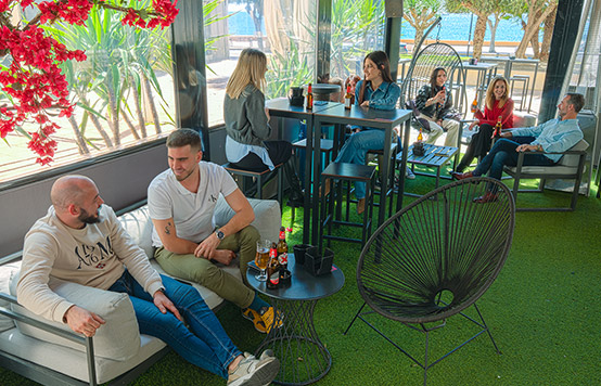 Uno de los principales atractivos de Bahía terraza lounge bar es nuestra hermosa terraza con vistas a la playa, ideal para cualquier ocasión. Gracias a su sistema de apertura, podemos adaptarla y crear un espacio completamente diáfano para disfrutar del entorno, perfecta para vivir tardes soleadas y momentos al aire libre con amigos y familiares frente al mar Mediterráneo.